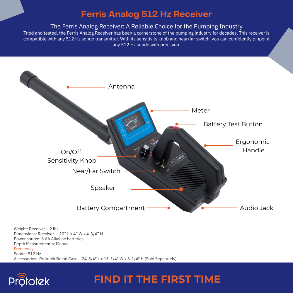 The Ferris analog receiver is simple to use and great when locating in cast iron, nonmetallic lines and septic tanks. It is compatible with our blue FTP-8 512 Hz flushable transmitter,ย Prototek’s 512 Hz DuraSonde line of transmitters and most sewer camera transmitters.