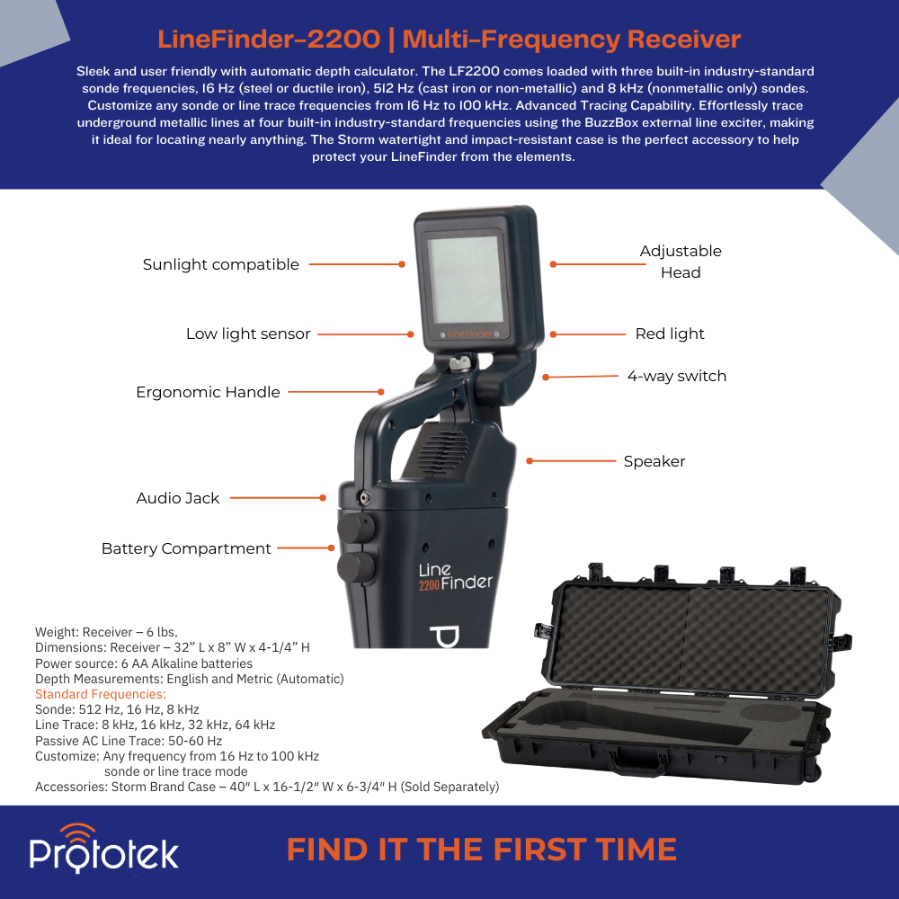 The LF 2200 comes loaded with three (3) built-in industry standard sonde frequencies; 16 Hz (steel or ductile iron), 512 Hz (cast iron or non-metallic) and 8 KHz (nonmetallic only) sondes. There are also four (4) built-in industry standard frequencies for line tracing using our external line exciter transmitter, the BuzzBox, and both products will fit securely into our hard carrying case.
